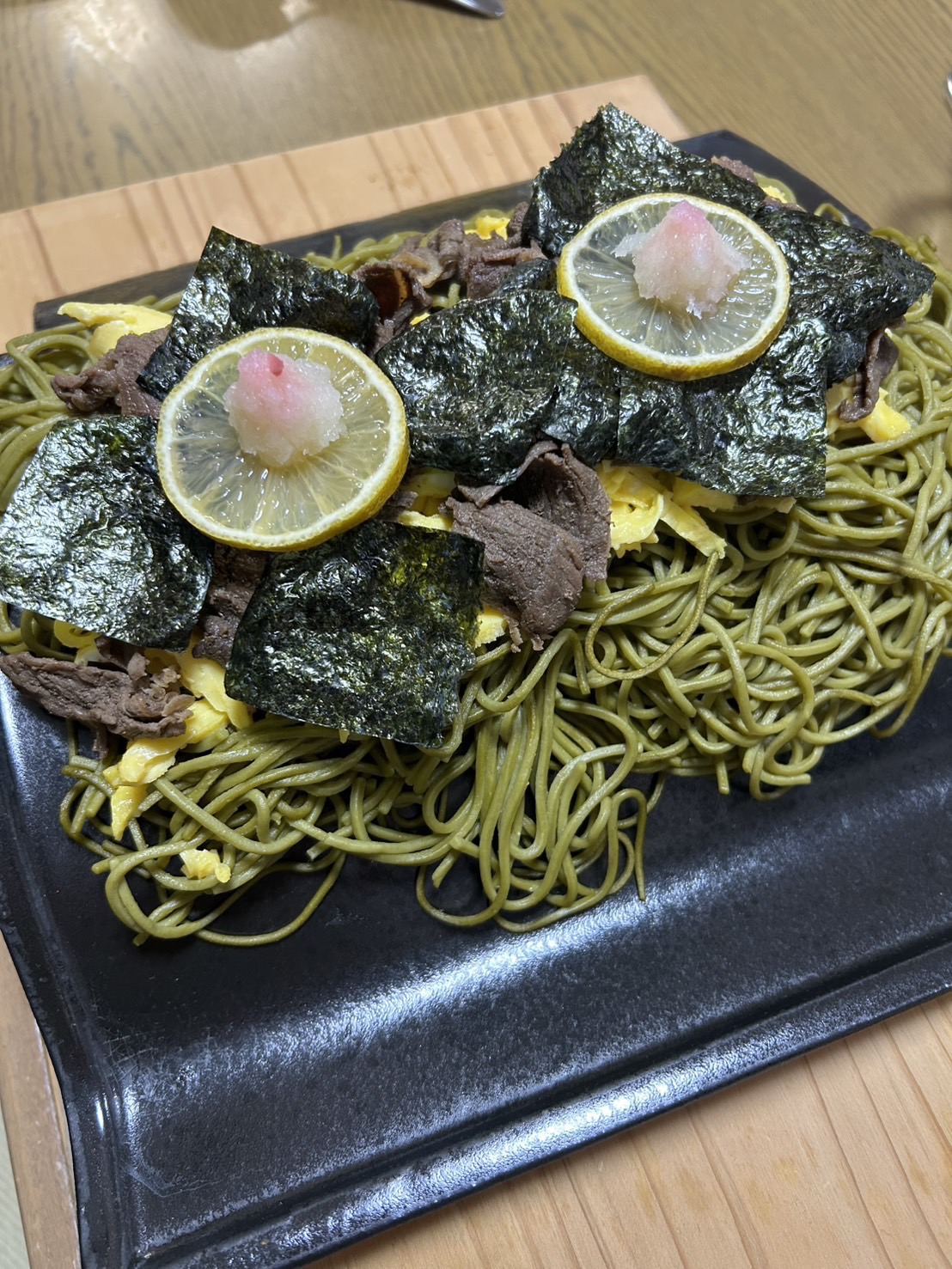 焼けたそばはカリッとなり、味付けした牛肉、錦糸卵と一緒に甘めのつゆにつけて食べるのがとても美味しいです♪