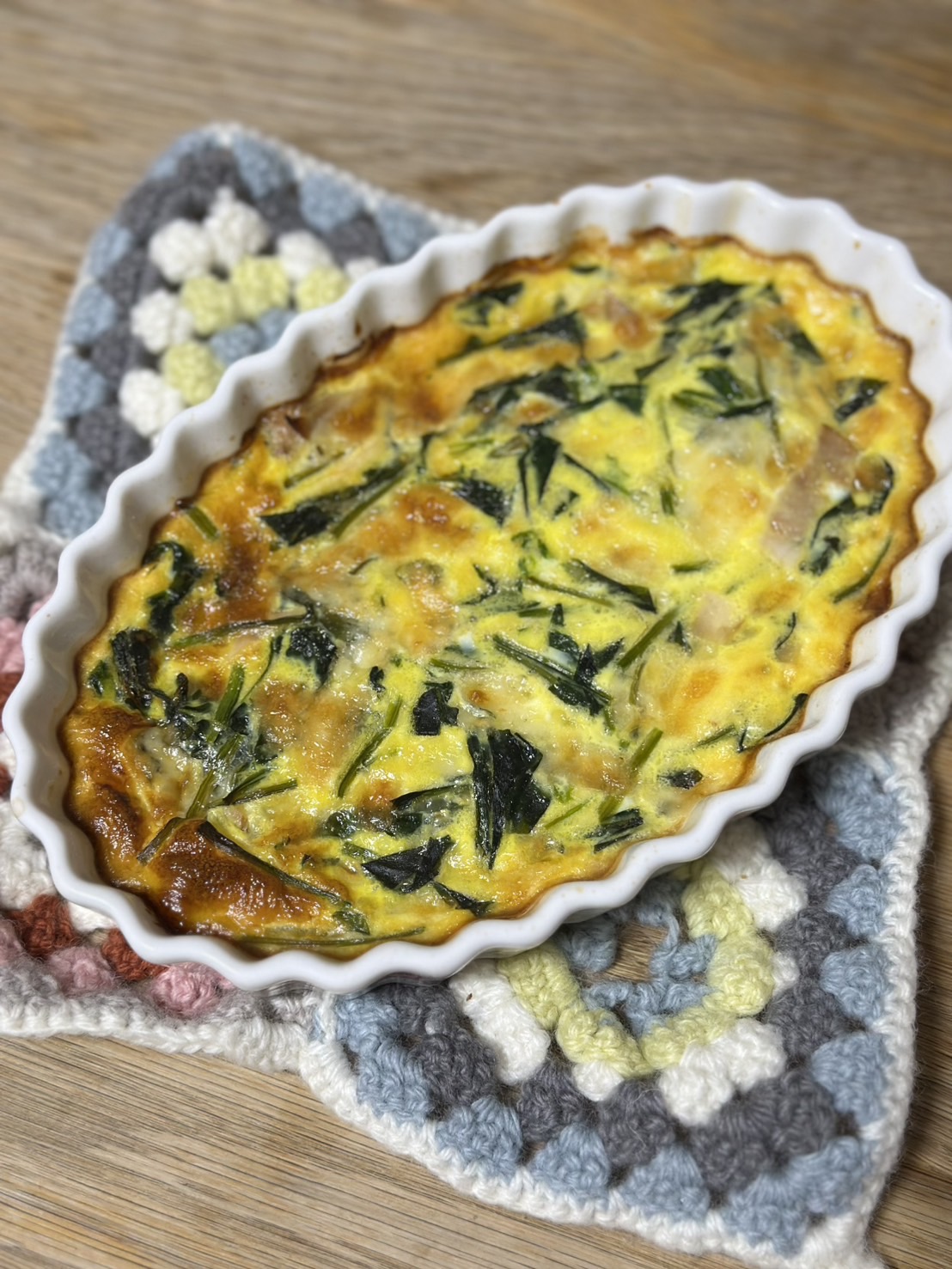 卵4つ、牛乳200ml、ピザ用チーズ140g、塩少々を混ぜたものに、茹でて絞ったほうれん草と切ったベーコンを混ぜて180度25分。