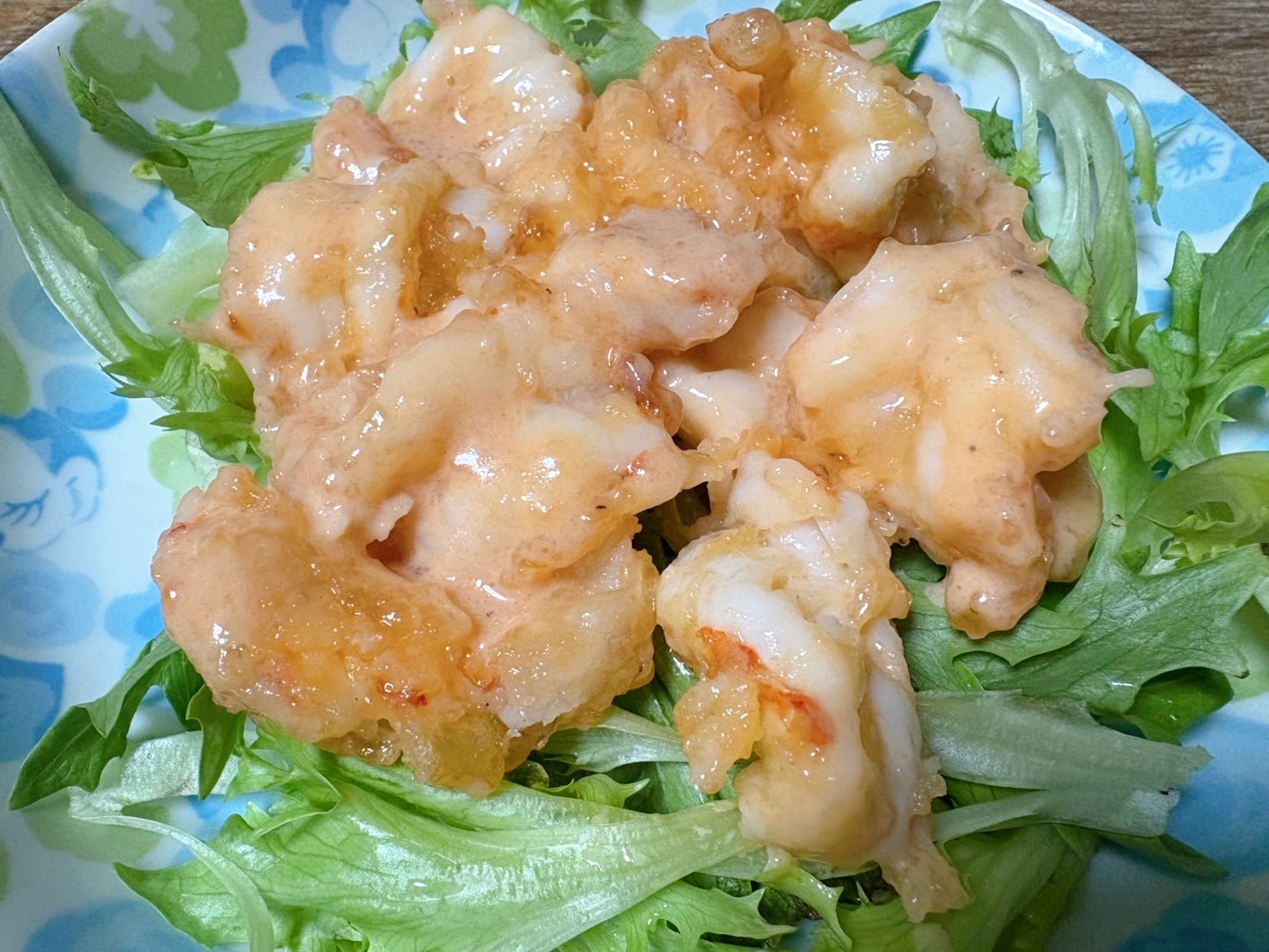 エビのお刺身に片栗粉塗して、揚げて、マヨケチャップを混ぜたタレに絡めていただきました!